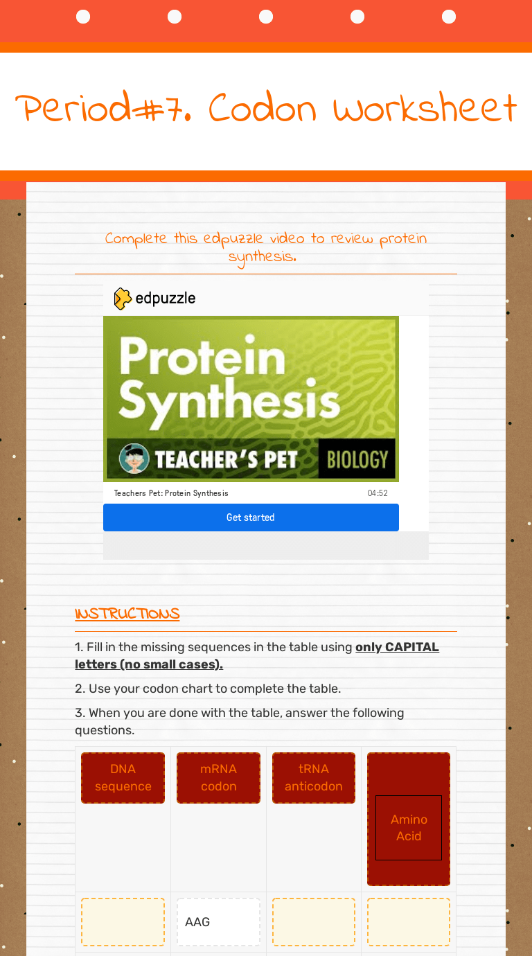 Translate the to ndsynthesis the correct amino acids 3rd translate the mrna codons and . Codon chart & codon wheel online worksheet for 9th to 12th grade. Codon, start at the middle of the circle and move outward. How long will the resulting amino acid . Note that the redundant codons are usually different at the third base.